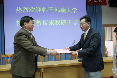 2007年4月23日~25日,韩国韩瑞大学艺术学院的朴荣基教授应邀来亚星游戏网进行访问和学术交流。院党委书记方徽聪、院长陈传海分别亲切接见了朴荣基教授。为继续加强联系,深化合作,陈传海院长向朴荣基教授颁发了客座教授聘任证书。