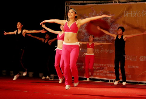 院健美操表演队首先闪亮登场。在随后的比赛中各参赛队利用音乐、舞蹈、色彩等元素把大学生活跃的思维、健美的身材表现得美轮美奂。男同学们热情的掌声一浪高过一浪,把比赛气氛推向高潮。