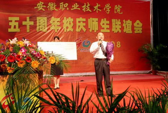 陈传海院长也在大会上致辞,他介绍了学院50年来的艰苦创业历程,指出学院50年孜孜不倦先后为国家培养和输送了5万多名合格的建设人才,他们在不同的领域,不同的岗位做出了惊人的业绩,推动了社会的发展,为经济发展做出了积极的贡献,他们是学院的光荣,是安职院人的骄傲;通过几代安职院人的不懈努力,学院四校合并后取得了一个又一个的突破,先后获得了多项殊荣,并于2007年被国家教育部确定为百所“国家示范性高职院校建设单位”,学院新校区也正式启用,成为合肥职教基地第一家入住新生的学院。他还指出,学院50年的办学历程,50年的教育创新,50年的辉煌发展,学院的每一次进步,都离不开每一代师生的努力,离不开校友们的关爱和支持,并希望校友能够一如既往地关心学院的发展。最后,陈院长祝福每位校友身体健康,合家欢乐,事业如同母校一样蒸蒸日上。