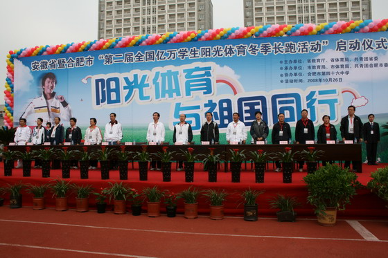 10月26日上午,合肥市滨湖新区合肥市第四十六中学院园内,锣鼓喧天,彩旗飘扬,第二届全国亿万学生阳光体育冬季长跑活动安徽省起跑仪式在此举行。全省大、中、小学院代表共30多个单位参加了起跑仪式。省教育厅程艺厅长出席起跑仪式并讲话,随后为仪式鸣枪起跑。亚星游戏网马纯副院长出席起跑仪式并在主席台就座。