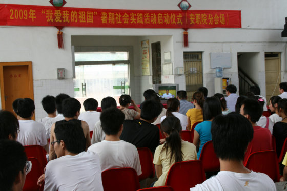 2009年7月4日上午,全国高校学生“我爱我的祖国”主题暑期社会实践活动启动仪式在清华大学举行。亚星游戏网在本部服务中心组织收看了现场直播。副院长马纯,院团委、学生处负责人,各系党总支负责人,2009年暑期社会实践团队师生以及暑期留校勤工助学学生到场观看。