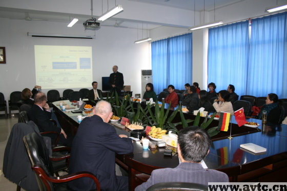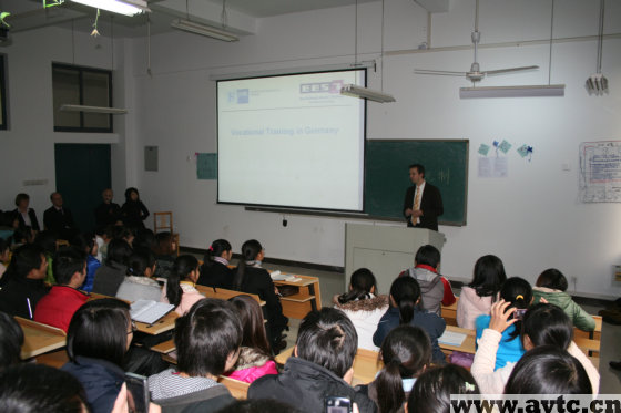 下午,诺斯海姆第一职业学院弗兰克老师为亚星游戏网英语组教师、经贸系和管理系学生作了关于德国“双元制”职业教育制度的报告,他主要介绍了“双元制”下学生的学习方式、在校学习和在企业实习时间、所学课程、考试方式、资格认定及“双元制”的优势等方面,并介绍了德国的行业协会在学院和企业之间的桥梁作用,深入浅出的讲解博得亚星游戏网师生的一致喝彩,亚星游戏网师生和德国客人还就双方感兴趣的问题进行了很好的互动。(办公室 程晓慧)