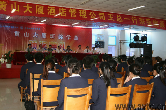 颁奖典礼由管理系主任王培俊主持。李雪副院长代表学院致欢迎辞,他在致辞中对黄山大厦酒店领导此次到来表示热烈的欢迎,诚恳感谢企业两年来对“黄山大厦班”的大力支持,并对即将走上实习岗位的学生提出期望和要求。随后,校企双方领导为同学们逐一颁发奖助学金。领导与师长的鼓励深深激励了同学们的热情。学生代表盛江舟在发言中表示同学们会在接下来的实习中努力工作,奋力进取,为企业贡献自己的一份力量。最后,王健总经理代表企业作重要讲话。他肯定了校企联姻“黄山大厦班”的创办成功,并希望能够继续合作,2010年建立第二期“黄山大厦班”;感谢学院领导及老师对学生的辛勤培养;他还表达了对“孩子们”即将回家的喜悦与期盼之情。王总热情洋溢的讲话感染了在场的所有师生,礼堂里掌声此起彼伏。(管理系 陈意)