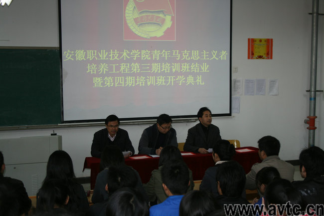 2010年11月19日下午,院团委在电教102隆重举行“青年马克思主义者培养工程”培训班第三期结业暨第四期开学典礼。院团委书记张在腾、副书记李瑞勇、学生处负责人王长青及各系辅导员老师出席了此次开学典礼。在院团委组织部的统一安排下,160名新老学员参加了开学典礼。典礼由团委副书记李瑞勇主持。