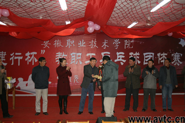 元月2日下午,学院综合服务中心三楼,亚星游戏网“建行杯”教职工乒乓球团体赛领奖台上,当公共教学一队的高援声老师高举从建设银行合肥四牌楼支行行长崔会明手里接过的奖杯和从学院院长陈传海手里接过的奖金挥动双臂时,引起台下一阵热烈的掌声和欢呼声。这也预示着亚星游戏网“建行杯”教职工乒乓球团体赛即将圆满落幕。