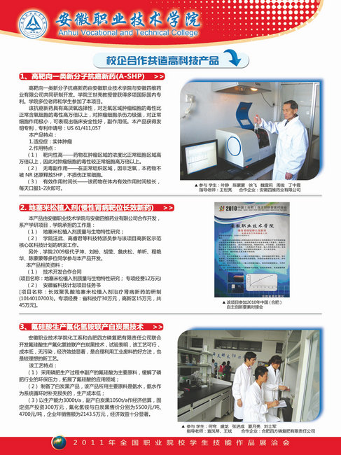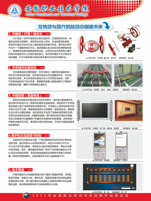 据了解,今年的各项展示活动规模比去年更大,形式也更加丰富。展洽会的参展项目多达900项,装备展的展出面积也多达25000平方米,都比上一届规模翻了一番以上。职业教育改革发展成果展通过“成果图文展”、“未来课堂”、“资源云”体验等多种形式,诠释了“展示职教风采、构筑人人成才之路”的主题。四项展示活动参展的1300多个展示项目,覆盖了第一、第二和第三产业的大约20多个行业的近50个专业。在展洽活动中,学院制作了五个专题的展板,展示了中国风概念车、未来城市交通系统、中国画卷(液晶电视)、电子算盘、高靶向一类新分子抗癌新药、保健红葡萄酒、养生米酒、高压低噪齿轮泵、齿轮马达泵、电动汽车四轮转向拉杆机构、语音控制运动小车、激光导向的自主运动节能小车、图像识别导向的自主运动小车、非电池供电的智能环保公交车等图片或实物,购买了触摸显示屏播放学院电视专题片和学生的创意设计作品,吸引了有关领导和众多兄弟院校的关注。