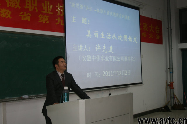 学院宣传办主任胡辉平首先介绍了安徽中伟车业有限公司以及许先进的概况,随后伴随着热烈的掌声迎来了许先进董事长热情洋溢的讲话。这是许先进首次在母校与广大同学进行心与心的交流,为大家确定人生定位听诊把脉,为学弟学妹提供真挚建议。