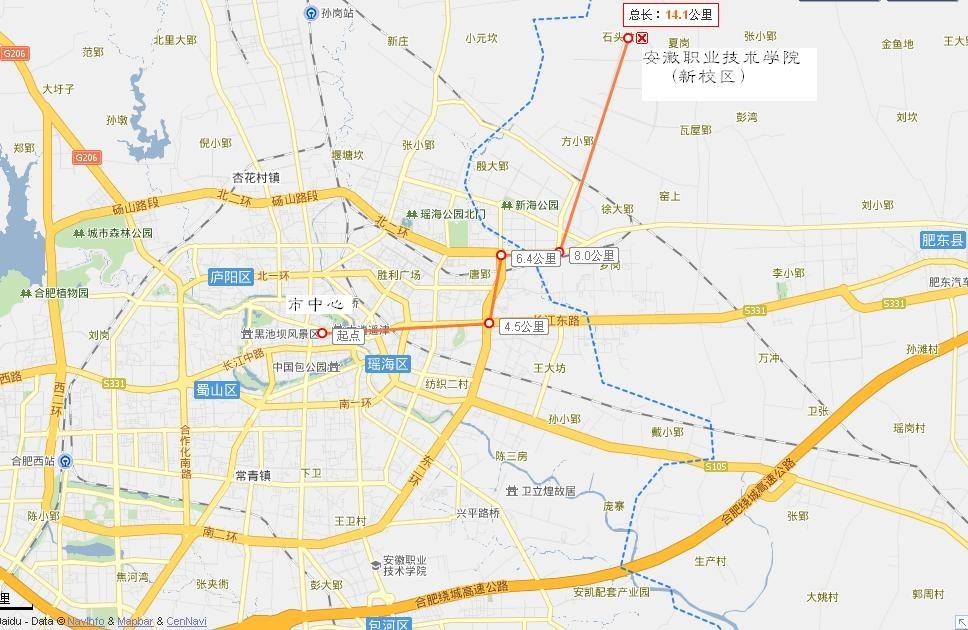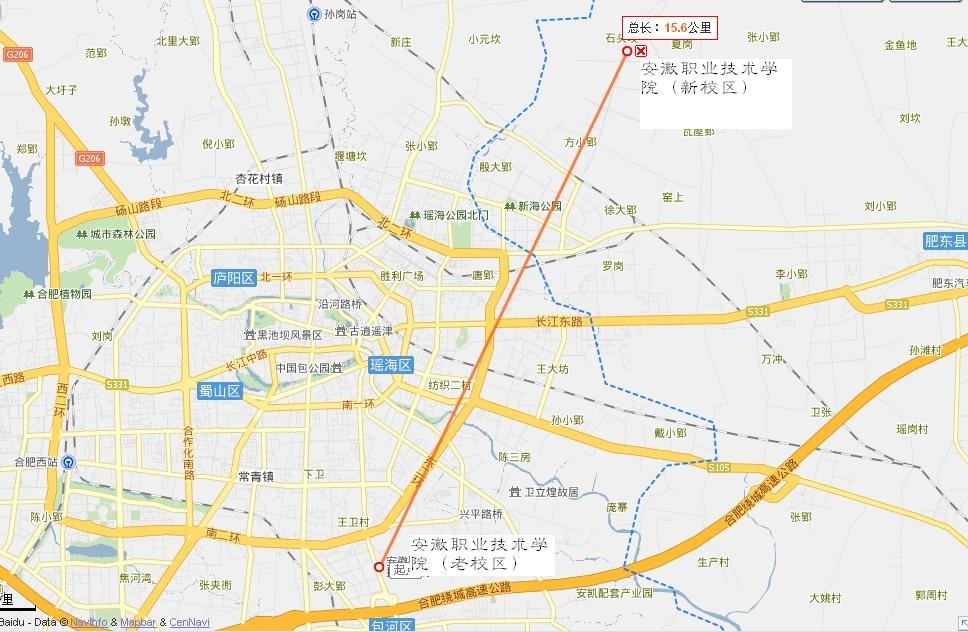 老校区西大门(包河大道)向右向北——马鞍山南路高架—南一环出口向东——长江东大街向东——东二环——向北至瑶海家具城右转—向东(振东大道)1.5KM --至(园上园住宅小区)--向北(文忠路)约15KM