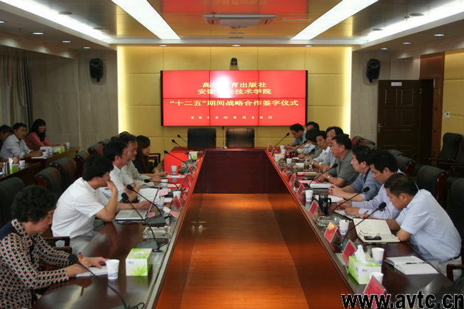 本网讯(教务处通讯员 花冬梅) 9月20日下午,高等教育出版社与学院在9楼会议室举行了 “十二五”期间战略合作协议签字仪式。高等教育出版社副社长陈建华、高职事业部主任助理王冰、技术部主任刘怀玉、计算机分社社长洪国芬、安徽省教学服务中心主任韩星、副主任徐海洋,省教育厅高教处处长储常连,学院院长陈传海、副院长李雪及院办公室、教务处、网络中心、图书馆负责人,各系部的正副主任参加了签字仪式。签字仪式由李雪主持。