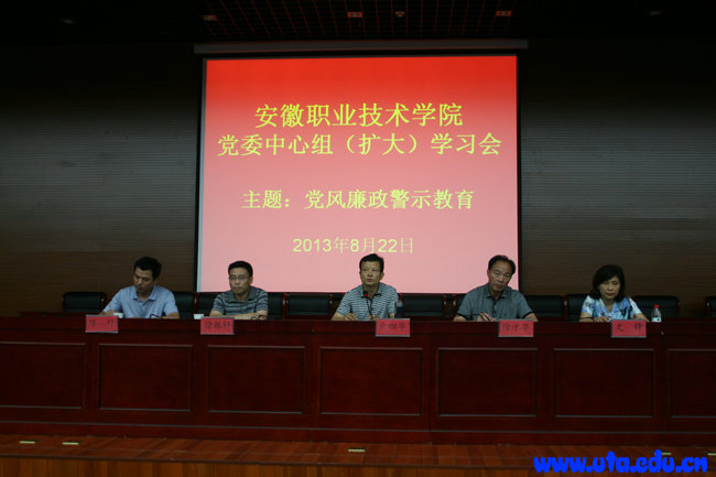 本网讯(宣传部 郝进平) 8月22日下午,院党委中心组在3楼报告厅召开扩大学习会,专题开展党风廉政警示教育。院领导亓四华、徐才华、徐振轩、史锋、陈行以及学院科级以上干部参加学习会。会议由副院长徐才华主持。