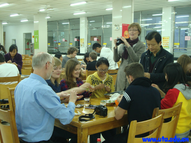 紧接着两国学生一起参与了具有中国特色的传统活动——包饺子,让德国学生亲身体验了中国文化的魅力。亓四华院长亲切探望了德国师生代表团还和德国学生一起包饺子。有些德国学生是第一次接触饺子,因此对于包饺子的手法非常陌生,亓院长便亲自向德国学生示范如何包饺子,并耐心指导德国学生。亓院长和冯•沛德进行了交谈,对他们的到来表示欢迎,还亲切询问了两国学生对此次活动的感受。冯•沛德表示此次活动十分有意义,德国学生可以通过参观和交流近距离地了解中国和中国人民,可以加深中德两国人民的友谊。最后,亓院长和学生们一起分享了饺子,两国学生的交流在热烈的氛围中推向高潮。