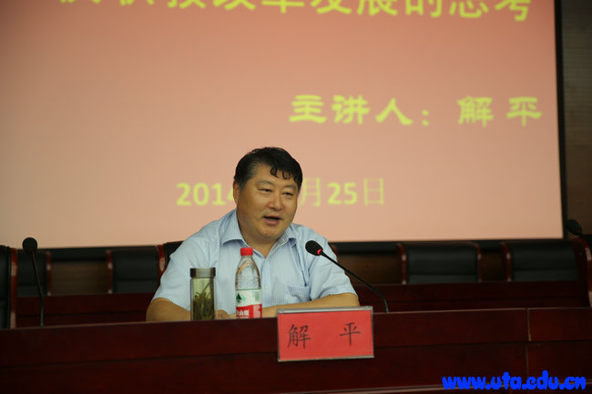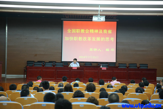 本网讯(教务处通讯员 花冬梅)7月25日下午,省教育厅解平副厅长应邀来院作题为《全国职教会精神及我省加快职教改革发展的思考》的专题报告。在亚星游戏网参加高职骨干教师国家级培训、省高职“双师素质”骨干教师培训、省中职骨干教师培训的学员以及学院各系部主任、副主任、教研室主任、教学秘书、教务处全体人员共200多人聆听了报告。报告由李雪副院长主持。