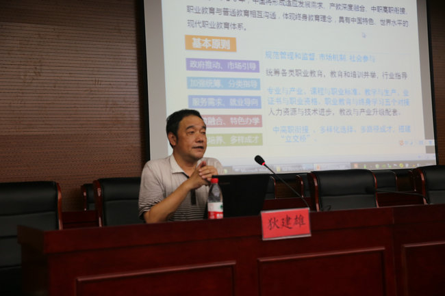 为扎实做好开展校内专业评估,全面推动学院专业建设,会上还邀请了南京工业职业技术学院狄建雄教授作《高职院校校内专业评估的实践》的专题报告。狄建雄从新形势下高职院校专业建设、校内专业评估理念以及解决好校内专业评估几个关键环节等方面,就开展校内专业评估进行具体讲解,对学院下一步开展校内专业评估工作起到很强的指导意义。