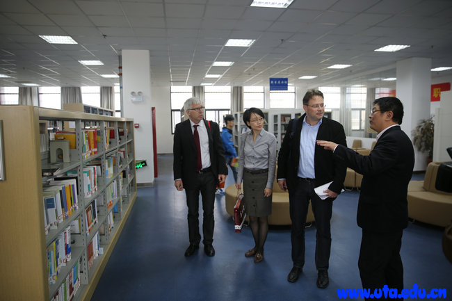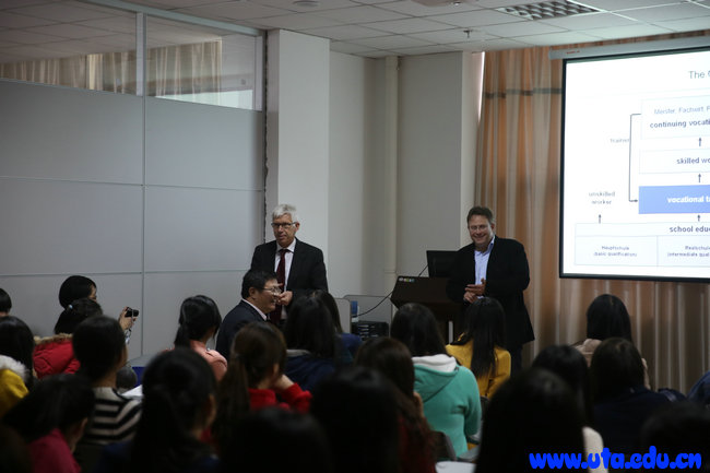在会见前,德克•卡瓦里克先生和马柯斯•柯恩先生给商务英语2012级的部分学生举办“德国职业教育体系”的讲座,他们介绍了德国职业教育的构架、职业教育在德国的地位以及德国学生如何在“双元制”的体系下进行学习的基本情况。学生还就自己感兴趣的问题进行了提问。德国客人还参观了图书馆、电气工程系、化学工程系和纺织服装系的部分实习实训室。