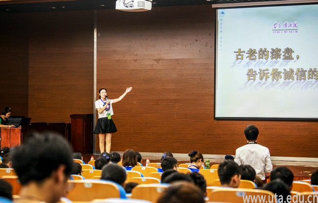 下午3:30分,安徽博物院志愿者黄国蓉、吴陵陵、陈潺、桂文丹、杨晓玲、李想、罗月寒、张云云等八位志愿者老师依次走上讲台,带给学院广大师生一场文化大餐。他们有的从楚国重器——楚大鼎讲起,讲解楚大鼎发掘过程、在历史上的地位以及中国古代青铜文化在世界文明史上的重要作用;有的从古老的漆盘谈起,讲述了一个诚信的故事,告诉大家诚信做人的深刻道理;还有的从小小的六尺巷讲起,使同学们了解六尺巷的历史渊源,告诉同学们在现实生活中要学会宽容的道理。整场宣讲涵盖了安徽出土文物、历史遗迹、历史名人、手工技艺等多方面内容,讲解视角独特,生动传神,挖掘出文物背后的历史故事,讲解至精彩之处,不时爆发出阵阵热烈的掌声。