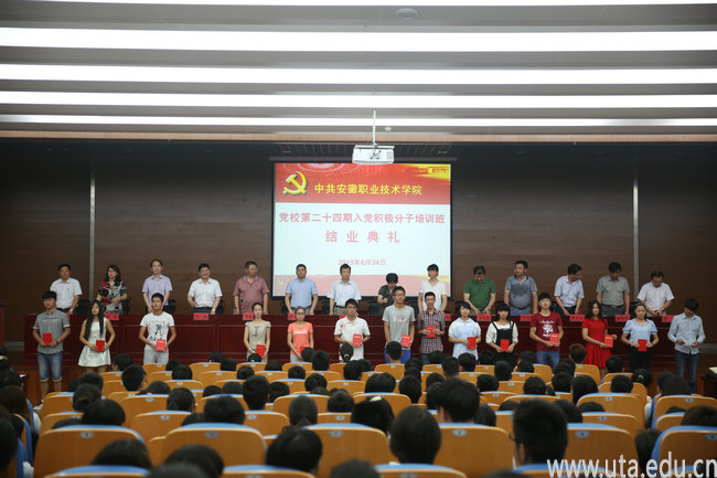 典礼在庄严的国歌声中拉开帷幕。黄琪首先通报了第二十四期党校培训班的考核情况,党委宣传部部长胡辉平宣读了《关于表彰院党校第二十四期培训班优秀学员的决定》,化学工程系生化1421班袁青青同学代表优秀学员上台做了发言。她代表广大学员表示,将以本次培训为契机和起点,在今后的学习和生活中更加严格要求自己,努力按照一名党员的标准来规范自己,处处起到先锋模范作用,不断努力,继续拼搏,为早日加入中国共产党而努力,为学院新的跨越式发展贡献自己的青春和力量!