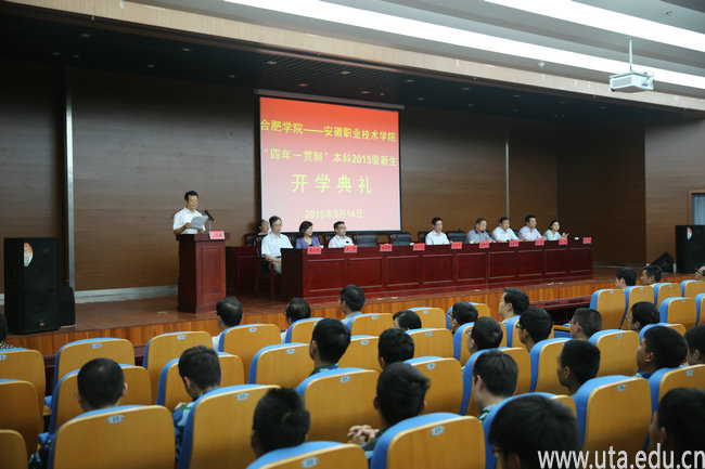 本网讯(教务处通讯员 张晓露)9月14日,学院在图文信息中心三楼学术报告厅举行2015级合肥学院—亚星游戏网“四年一贯制”本科新生开学典礼。学院院长亓四华、副院长徐才华、党委副书记徐振轩、副院长李雪、副院长史锋、副院长陈行、纪委书记蒋永忠以及相关部门负责人、全体2015级本科新生出席开学典礼。合肥学院副院长刘建中、学生处长董承军、招生办胡萍老师应邀出席典礼。徐才华主持开学典礼。