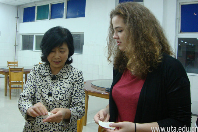 19日上午,德国学生和亚星游戏网学生一起上武术和乒乓球的体育课,两国学生在体育老师的指导下练习了武术和乒乓球。德国学生与亚星游戏网英语协会、手工协会的学生一起练习做剪纸和手工,并在书法协会学生的指导下用毛笔写下自己的中文名字,亚星游戏网的学生还把自己的书法和绘画作品作为礼物送给德国客人。随后,德国学生和亚星游戏网学生一起自己动手包饺子。德国师生还在学院外事办的老师陪同下参观了合肥市政务区。