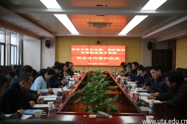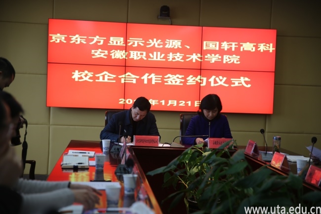史锋代表学院分别与合肥京东方显示光源有限公司总经理姚清、合肥国轩高科动力能源有限公司叶要武副总裁签署合作协议。政校企三方并就今后的校企合作的进一步开展进行了深入细致的交流。