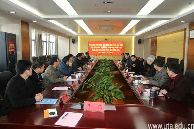 本网讯(院办通讯员 郝进平)3月13日,安徽农业大学党委书记宛晓春、副校长马传喜及安徽涉外经济职业学院董事长王叙平等一行13人来亚星游戏网考察交流。院党委书记亓四华、副院长陈行、纪委书记蒋永忠热情接待了来宾。学院相关部门负责人参加座谈交流。