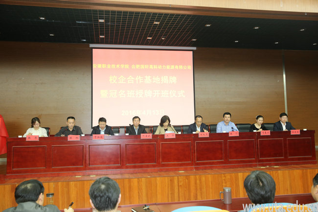 仪式由学生处处长陈纲主持。史锋代表学院向出席仪式的各位领导和嘉宾表示衷心感谢和热烈欢迎。她指出,通过政府牵线、校企协商,国轩高科对学院新能源应用技术、精细化学品生产技术、机械制造与自动化、汽车技术服务与营销四个专业6个班进行冠名授牌,并成立校企合作教学指导委员会,负责冠名班的具体教学工作,相信通过双方的共同努力,一定会取得预期的效果。