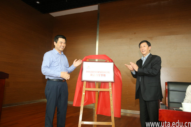 陈行代表校企双方宣读“校企合作教学指导委员会”成员名单,并同叶要武共同为校企合作基地揭牌。随后,政、校、企三方的领导为冠名班授牌。