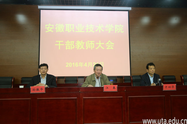 亓四华从党建和事业发展两个方面具体报告了学院工作。他指出,2015年度学院贯彻落实全面从严治党,不断提高党建科学水平:一是加强班子自身建设,贯彻落实民主集中制;二是深入开展专题教育,不断提高党员干部党性修养;三是强化思想引领,牢牢掌握意识形态工作领导权和主导权;四是选好用好管好干部,加强人才队伍建设;五是加强基层党组织建设,强化党员队伍教育管理;六是坚持全面从严治党,着力推进党风廉政建设;七是坚持依法治校,进一步完善现代大学制度;八是注重文明校园创建工作,着力构建和谐校园。他指出,2015年度学院坚持改革创新,努力推动学院教育事业科学发展:一是深入推进教育教学改革,人才培养工作水平不断提升;二是推进创新创业教育改革,教科研水平不断提升;三是坚持“以生为本”工作理念,学生管理工作进一步加强;四是招生就业工作势头良好,各项指标稳中有升;五是人事管理工作不断加强,师资水平有新的提高;六是内部管理工作继续加强,服务保障能力进一步提升;七是新校区建设有条不紊,老校区处置攻坚克难。亓四华指出,2015年度学院党的建设和事业发展取得的进步,是全院师生团结一致、奋发努力的结果。2016年是学院“十三五”发展规划开局之年,也是学院地方技能型高水平大学建设和全面深化综合改革起步之年。学院将继续发扬敢于挑战、追求卓越的精神,凝心聚力,开拓创新,扎实工作,不断开创学院建设、发展新局面!