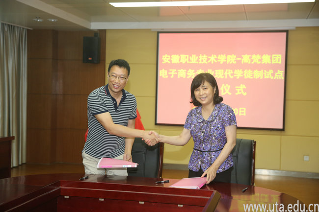 本网讯(经贸系通讯员 范海宁)6月20日下午,亚星游戏网与安徽贵谷电子商务有限公司(简称高梵集团)在院图文信息中心十楼会议室隆重举行“现代学徒制试点班”签约仪式。学院副院长史锋,高梵集团副总裁李伟,学院教务处处长杨林国,高梵集团各运营团队经理,经贸系领导班子成员及电商专业负责人,全体“高梵电商学徒制班”42名同学参加了签约仪式。签约仪式由经贸系主任吕时礼主持。