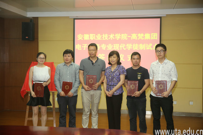 最后,双方领导为“现代学徒制----高梵电商班”揭牌,史锋为高梵集团的企业师傅颁发了聘任证书。随后,双方与会人员合影留念。