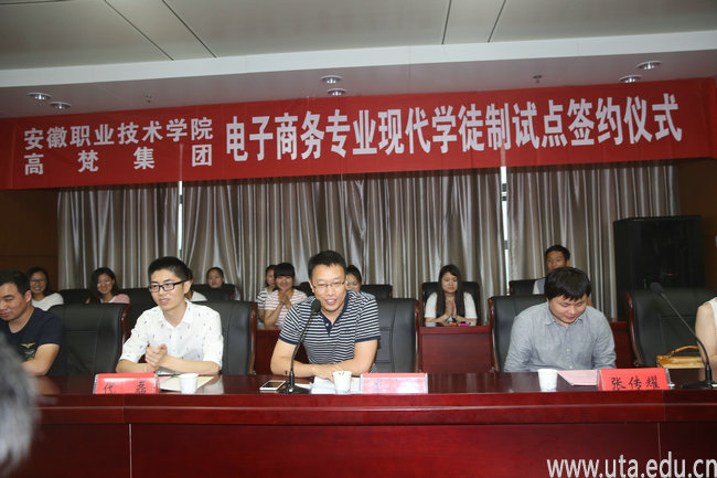 随后,李伟介绍了高梵集团的发展历程、企业文化和企业发展的主要成绩,感谢学院对高梵集团的信任。他表示,企业将和学院一起制订现代学徒制人才培养方案,企业师傅将认真履职,认真带好班级中的每一位徒弟,精心传授技艺,为我省现代职业教育的发展贡献力量。高梵电商班的汪雅星同学作为该班代表发言。她表示将珍惜这次难得的机会,认真学习,刻苦训练,为未来工作打下坚实的基础。