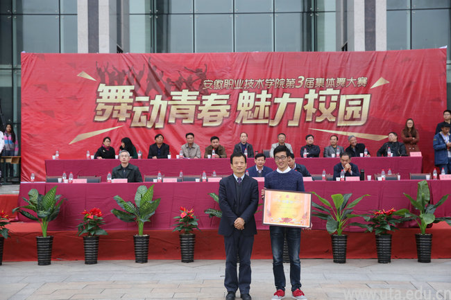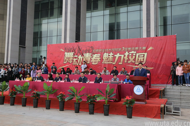本网讯(院团委通讯员 沈天明)11月16日,以“舞动青春,魅力校园”为主题的第三届校园集体舞大赛在图书馆南广场隆重举行。党委书记亓四华、校长孙敬华、副校长史锋、陈行,纪委书记蒋永忠、督导员李文钢、铁道学院院长王琨及学院有关处室、二级学院党政负责人应邀出席大赛,各二级学院党总支书记担任大赛评委。