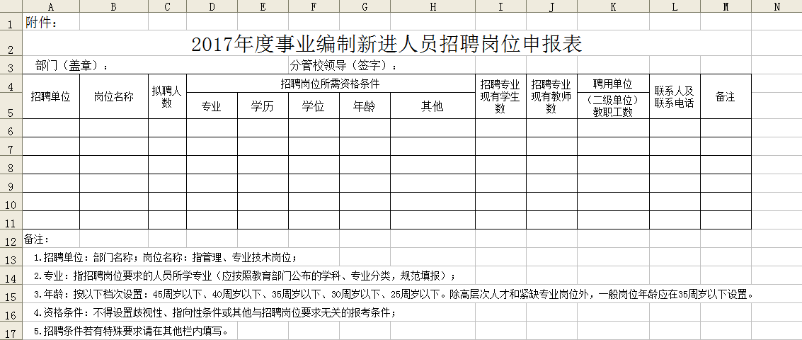 4、请各部门、各单位严格按照上述要求,认真编制2017年度新进人员计划,填写《2017年度事业编制新进人员招聘岗位申报表》(见附件),并于2017年1月19日前将电子版和纸制报表(加盖部门章,由分管校领导签字)送人事处。