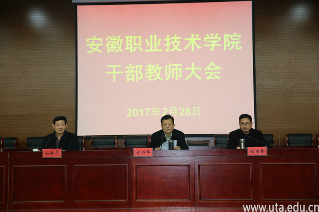 亓四华代表学院党政领导班子作2016年工作总结报告。他首先汇报了我校2015年度综合考核反馈意见整改落实情况。接着从强化学习,加强思想政治建设;聚焦重点,做好各项整改工作;立足基层,夯实党建工作基础;落实责任,加强党风廉政建设等4个方面,对学院贯彻落实全面从严治党,不断提高党建工作科学化水平作了全面总结。从教育教学改革深入推进,人才培养工作水平不断提升;坚持“以生为本”工作理念,学生管理工作进一步加强;招生就业工作势头良好,各项指标稳中有升;内部管理工作继续加强,服务保障能力进一步提升;文明校园创建工作持续加强,和谐校园建设取得实效等5个方面,对学院坚持改革创新,努力推动学院教育事业科学发展情况作了总结。最后,他强调,2017年是学院改革发展的关键之年,摆在我们面前的任务还相当艰巨。我们将继续发扬敢于挑战、追求卓越的精神,凝心聚力,开拓创新,扎实工作,不断开创学院建设、发展新局面。