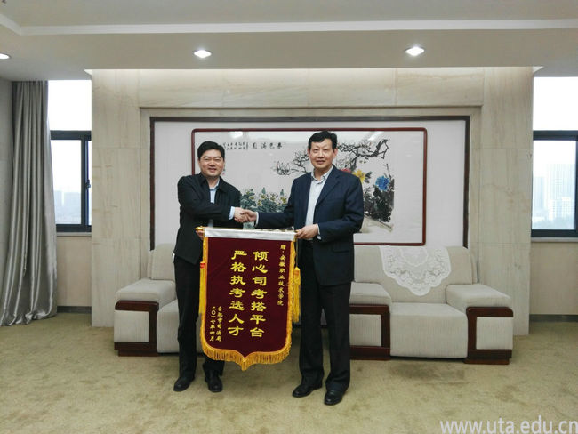 本网讯(教务处通讯员 李德明)4月19日下午,在学院图文信息中心九楼接待室,合肥市司法局刘晓文局长一行,代表合肥市司法局向我校赠送一面写着“倾心司法搭平台,严格执考选人才”的锦旗,感谢我校在国家司法考试中所做的各项工作。我校校长孙敬华、院办公室主任宣岩松和教务处副处长宣凤琴参加了赠旗仪式。