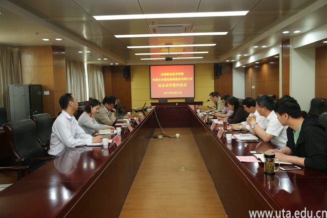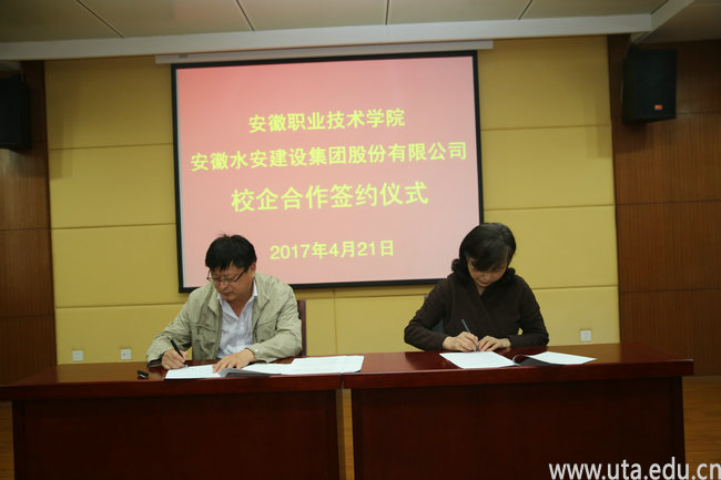 本网讯(机电学院通讯员 秦连好)4月21日上午,我校与安徽水安建设集团股份有限公司(以下简称水安集团)在图文信息中心十楼第三会议室隆重举行校企合作“水安班”签约仪式。学院副校长史峰、水安集团董事长薛松、水安集团“水安班”相关负责人、学院建筑工程学院、财经商贸学院、铁道学院、机电工程学院相关人员参加了签约仪式。签约仪式由机电工程学院副院长洪应主持。