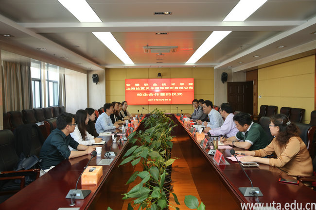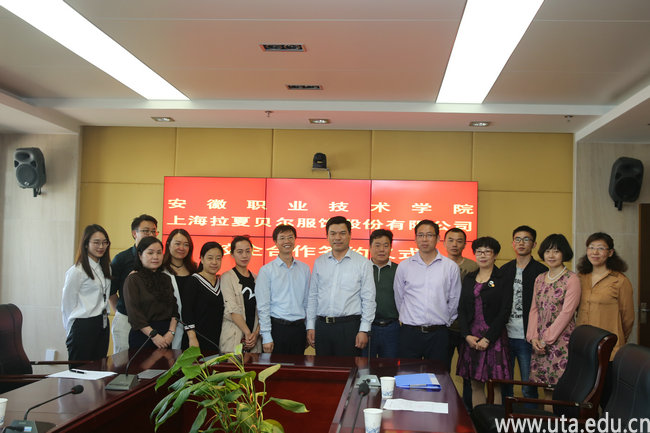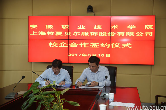 本网讯(纺织服装学院通讯员 刘骏)5月10日,我校与上海拉夏贝尔服饰股份有限公司签约仪式在图文信息中心九楼会议室举行。上海拉夏贝尔服饰股份有限公司人力资源总经理程方平、人力资源总监周雪菲、培训经理禚静等企业领导,我校副校长陈行以及校办公室、实训中心、纺织服装学院等部门相关负责人和教师代表参加签约仪式。