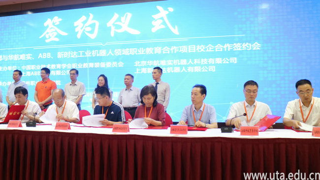 本网讯(机电学院通讯员 洪应)日前,教育部印发了《关于公布华航唯实、ABB、新时达工业机器人领域职业教育项目合作院校名单的通知》(教职成司函[2017]14号),我校成功获批“工业机器人培养中心”立项单位,2017年6月26日上午我校副校长史锋率领机电工程学院相关工作人员出席了第一批签约仪式。