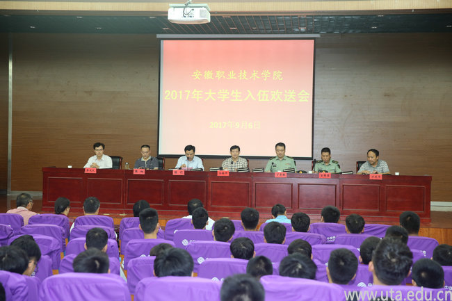 本网讯(保卫处通讯员 王胜璋)为鼓励大学生参军,欢送新兵光荣入伍,9月6日,学院在图文信息中心三楼学术报告厅举行2017年大学生入伍欢送会。校长孙敬华,瑶海区委常委、武装部政委丁秀雅,瑶海区武装部政工科长吕国栋,院团委、学生处、保卫处、人武部等部门主要负责人,各二级学院党总支书记,新入伍的39名新兵以及各二级学院部分学生代表参加欢送会。欢送会由副校长陈行主持。