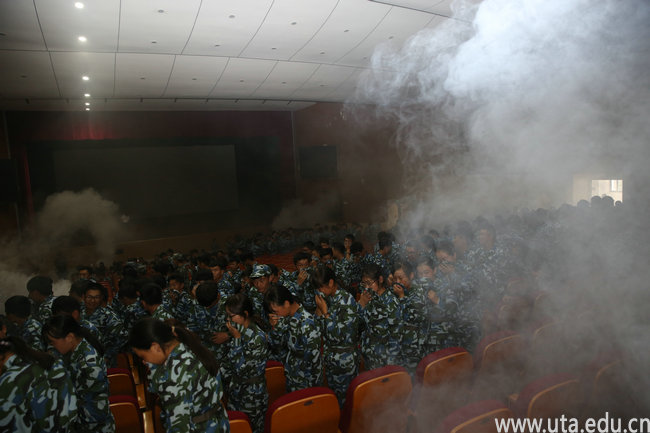 9月18日上午9时18分,防空警报鸣响,消防演练烟饼同时点起。正在学院大礼堂接受入学教育的七个连队新生,在保卫处全体老师和军训教官的带领下,快速有序地撤离现场,并在指定的安全区域集合。整个疏散撤离过程安全、有序、快速,时间不到两分钟。