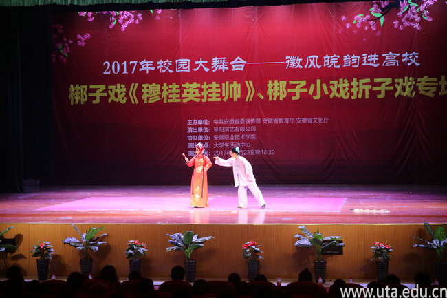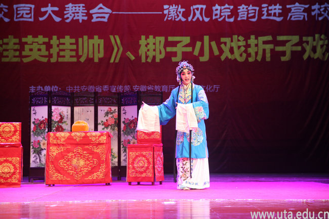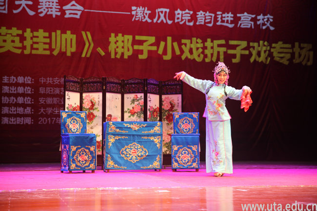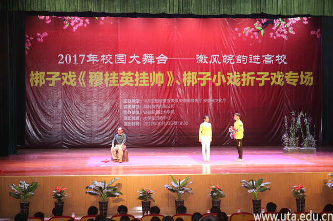 本网讯(院团委通讯员 胡婷)为进一步学习宣传贯彻落实党的十九大精神和习近平总书记系列重要讲话精神,提高大学生艺术修养和文化素质,推动安徽优秀传统文化在高校的传播和普及,10月25日,由省委宣传部、省教育厅、省文化厅主办,亚星游戏网、阜阳市演艺有限公司承办的2017“校园大舞台——徽风皖韵进高校”戏曲晚会在学院大礼堂隆重举行。来自阜阳市演艺有限公司的梆子戏艺术家们为五百余名师生献上了一场高水平的视听盛宴。