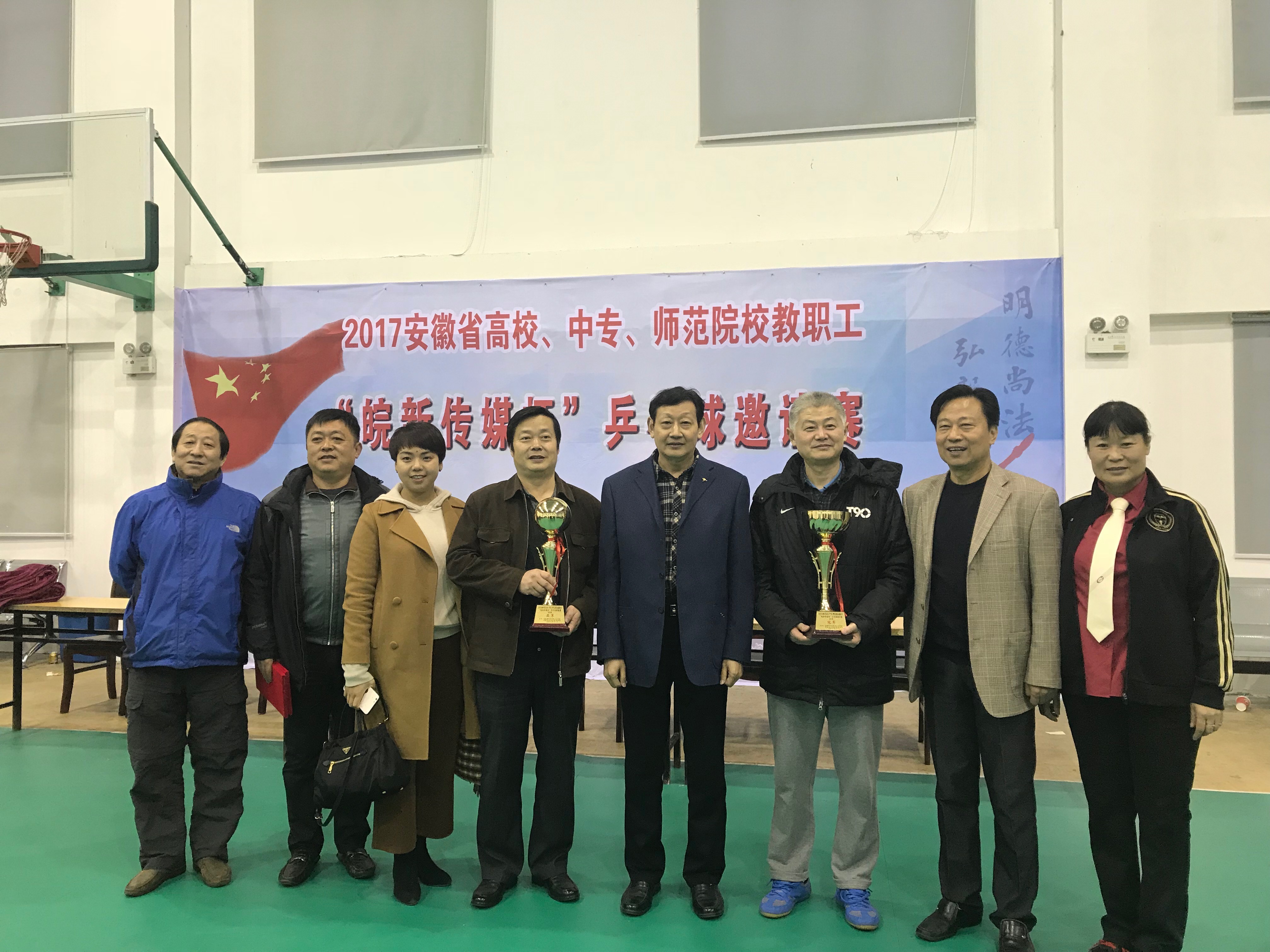 本网讯(校工会通讯员 贾亮亮)11月18日至19日,安徽省高校、中专、师范院校教职工乒乓球邀请赛在安徽警官职业学院举行,校长孙敬华,党委副书记、纪委书记郭淼带领我校乒乓球协会组队参赛,经全体队员的团结协作和奋力拼搏,获得了领导组男子单打冠军、男子团体亚军、女子团体季军的好成绩。