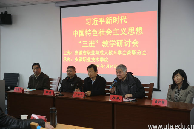 本网讯(党委宣传部 孙静)1月24日,由安徽省职业与成人教育学会高职分会主办、亚星游戏网承办的习近平新时代中国特色社会主义思想“三进”教学研讨会在我校图文信息中心五楼会议室举行。来自省内20多所高职院校的50多位宣传部长、马克思主义学院院长、学科带头人、思政课骨干教师参加教学研讨。安徽省职成教学会高职分会副会长、党委书记亓四华,党委副书记、纪委书记郭淼出席开幕式,开幕式由郭淼主持。