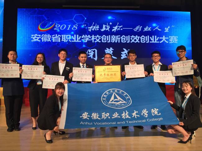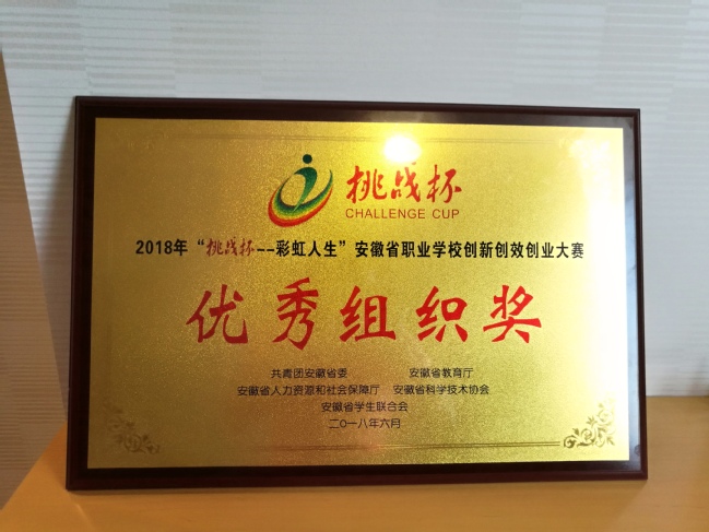 2018年“挑战杯——彩虹人生”安徽省职业学院创新创效创业大赛是由团省委、省教育厅、省人社厅、省科协、省学联主办的一项具有导向性、示范性和群众性的创新创业创效竞赛活动。大赛以“倡树职业精神、培养创新意识、提升创效能力、造就创业人才”为宗旨,旨在积极引导和激励学生实事求是,刻苦钻研,走理论和实践相结合的道路,培养他们的创新人格和创新思维能力。本次决赛,共有全省71所职业院校、128件参赛作品参加答辩,我校成绩在全省名列前茅,并荣获“优秀组织奖”。