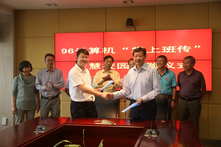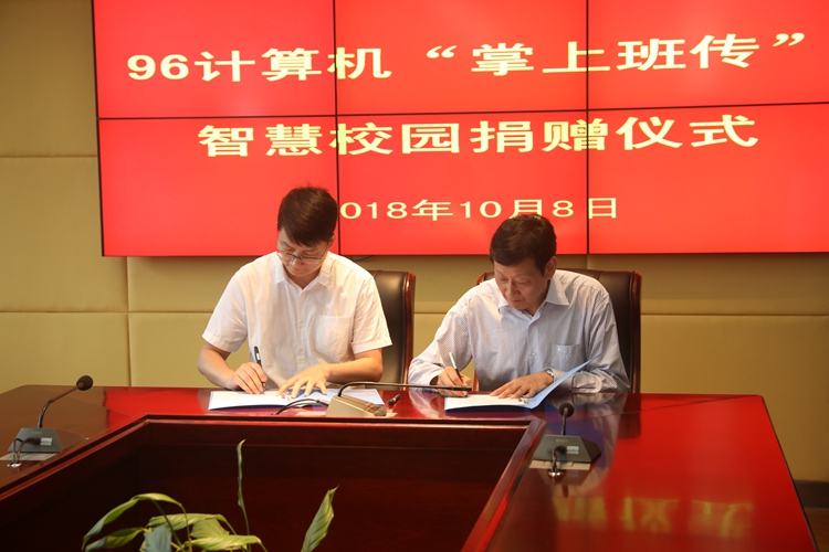 本网讯(信息工程学院通讯员 胡春雷)10月8日下午,“掌上班传”智慧校园捐赠仪式在图文信息中心九楼会议室举行。校长孙敬华、捐赠人代表计算机专业96级校友董友法,教务处、财务处、网络中心等相关职能部门负责人及96级计算机班主任葛小竹参加捐赠仪式。仪式由信息工程学院副院长李京文主持。
