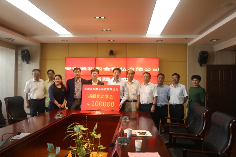 本网讯(实训中心通讯员 吴家奎)10月8日下午,安徽迪科数金科技有限公司奖助学金捐赠仪式在图文信息中心九楼会议室举行。校长孙敬华、迪科数金总经理吴福全、校企相关部门负责人共同参加了仪式。