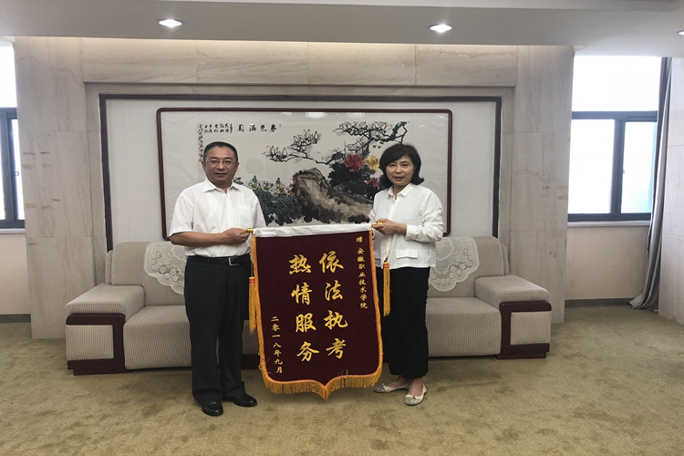 本网讯(教务处通讯员 李德明)近日,合肥市司法局副局长王逸枫一行,代表市司法局向我校赠送一面写着“依法执考,热情服务”的锦旗,感谢我校近年来在国家司法考试安徽考区中所做的工作。