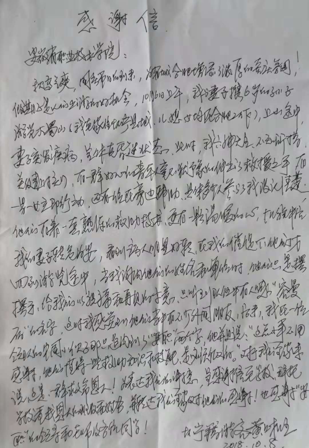 看到老人安全以后,几位留学生没有留下姓名就离开了。老人经过多方打听得知为我校柬埔寨留学生,特意委托其女儿携带自己的亲笔感谢信来到学院,对几位留学生当面表示感激之情,也对学院及带队老师致以诚挚谢意。