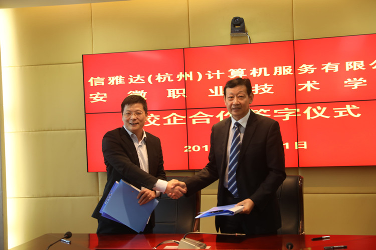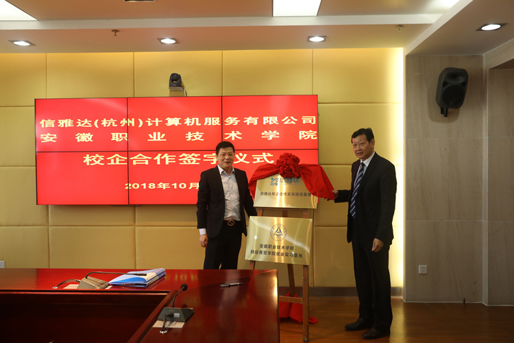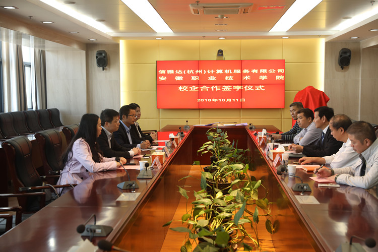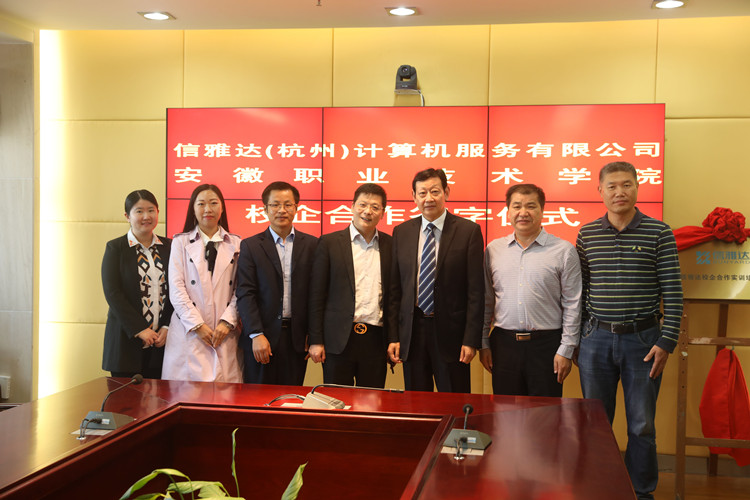 本网讯(财经商贸学院通讯员 范海宁)10月11日上午,我校与信雅达(杭州)计算机服务有限公司校企合作签约揭牌仪式在图文信息中心九楼会议室隆重举行。信雅达(杭州)计算机服务有限公司董事长孔明、运营中心事业部经理(安徽金斗云数据科技有限公司总经理)张厚东、人力资源部经理李苗苗、安徽金斗云数据科技有限公司总经理助理郝晴雯,我校校长孙敬华、实训中心主任王道泉、财经商贸学院院长刘玉杰、副院长桂树国等出席了仪式。仪式由刘玉杰主持。