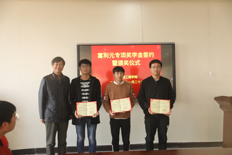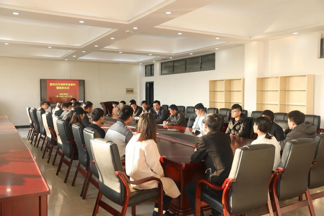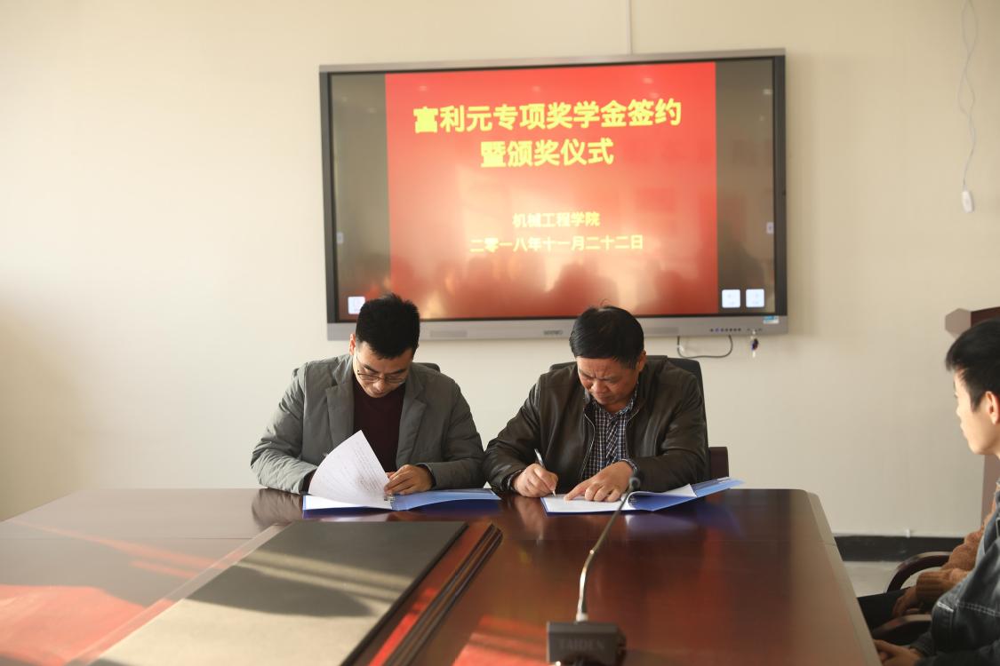 本网讯(机械工程学院通讯员 周福静)为进一步加强校企合作力度,激励学生勤奋学习、刻苦钻研、全面发展,合肥富利元投资基金(北京)有限公司捐资在我校机械工程学院设立“富利元”专项奖学金。近日,“富利元”专项奖学金签约仪式暨颁奖仪式在机械工程学院举行。公司领导徐之海、闫飞、陈寿涛、洪勇军、吴建华,党委委员、副校长陈行,学院党政负责人及获奖的20位同学参加颁奖仪式。学院党总支负责人刘荣祥代表机械工程学院与合肥富利元投资基金(北京)有限公司代表闫飞签订协议,院企双方领导为获奖同学颁奖。学院副院长郑家房主持仪式。