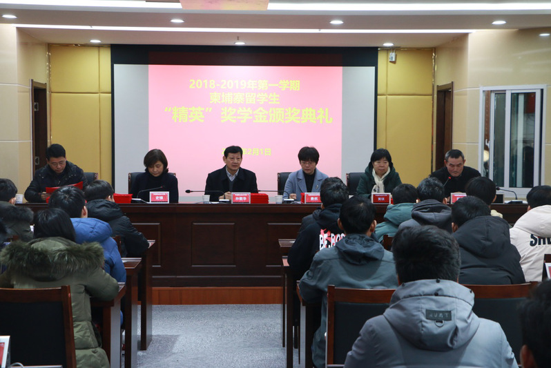 本网讯(国际教育学院 吴群)2019年2月1日,我校举行了首批柬埔寨留学生2018~2019第一学期“精英”奖学金颁奖仪式。校长孙敬华、副校长史锋、合肥精英培训学院校长费然、机电学院领导、国际教育学院有关负责人、留学生辅导员及全体柬埔寨留学生等参加了颁奖仪式。颁奖仪式由机电学院副院长洪应主持。